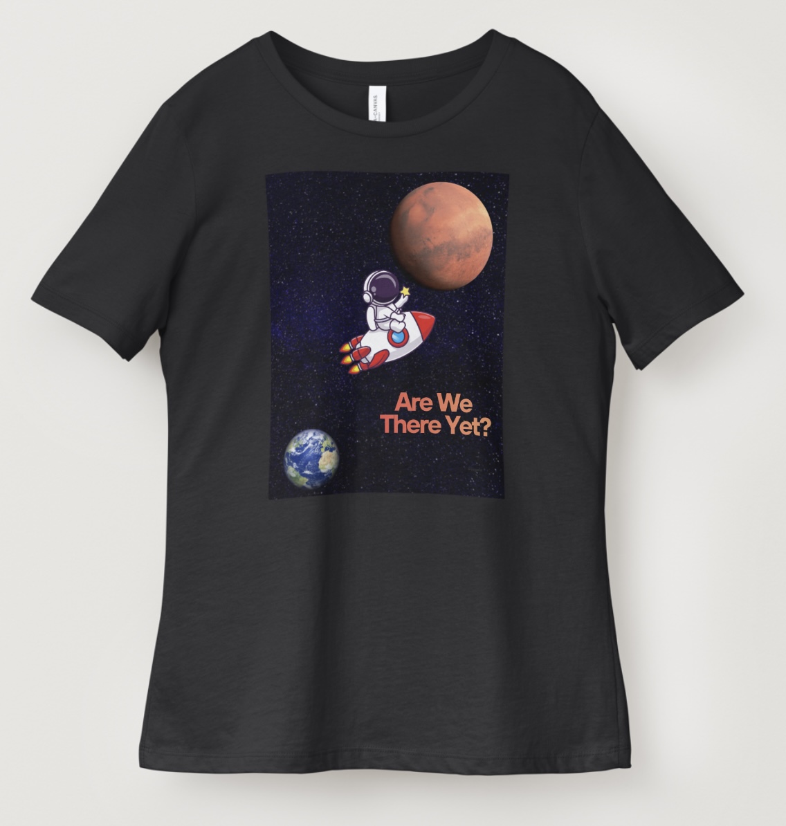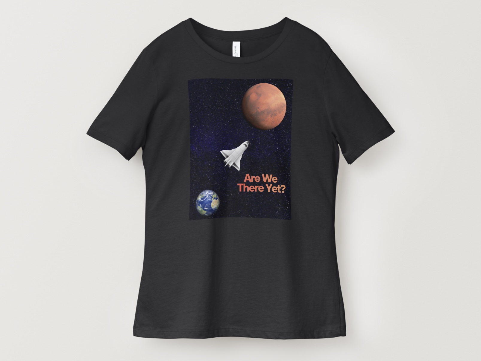 The “Are We There Yet” spaceship design is a collaboration between my sister Elena and I. We each submitted a design of it with a differing rocket graphic.